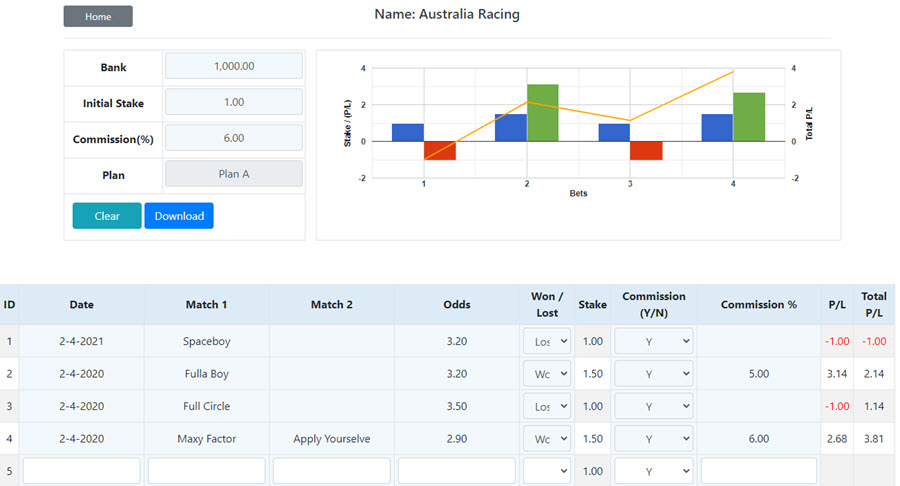 Bookies, TAB or Exchanges..Regardless of where you bet the online staking software allows you an accurate guide of the returns. Exchange players you can allow for commission, making accurate records easy to keep. Graphs:Visual is great and reflects in an instant how the plan is going for you, and whether it is time to take a profit and restart to keep stakes real. Or conversely pull the plug on that staking sequence, reflect and refine, and go again.