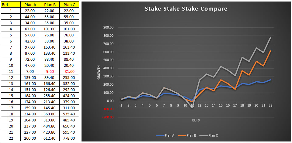Big Difference: £518.00 more profit in the most aggressive staking Plan C,compared to the conservative Plan A